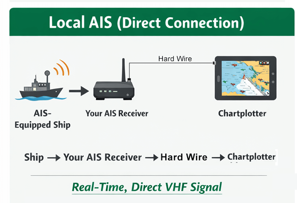 Now, there is one important exception that people should know about, because it’s where tablets and apps actually can be completely legitimate. If your app is connected directly to your own onboard AIS receiver or transponder via Wi-Fi or a wired NMEA gateway, then the app is not using internet AIS at all. In that setup, the app is simply displaying the same raw AIS sentences your chartplotter would display. The data path is direct again: ship broadcasts on VHF, your AIS receiver hears it, and your app displays it locally. Architecturally, that’s equivalent to a chartplotter. The practical risks are different—Wi-Fi can drop, tablets can sleep, batteries can die—but the underlying AIS information is the same real-time local radio data.